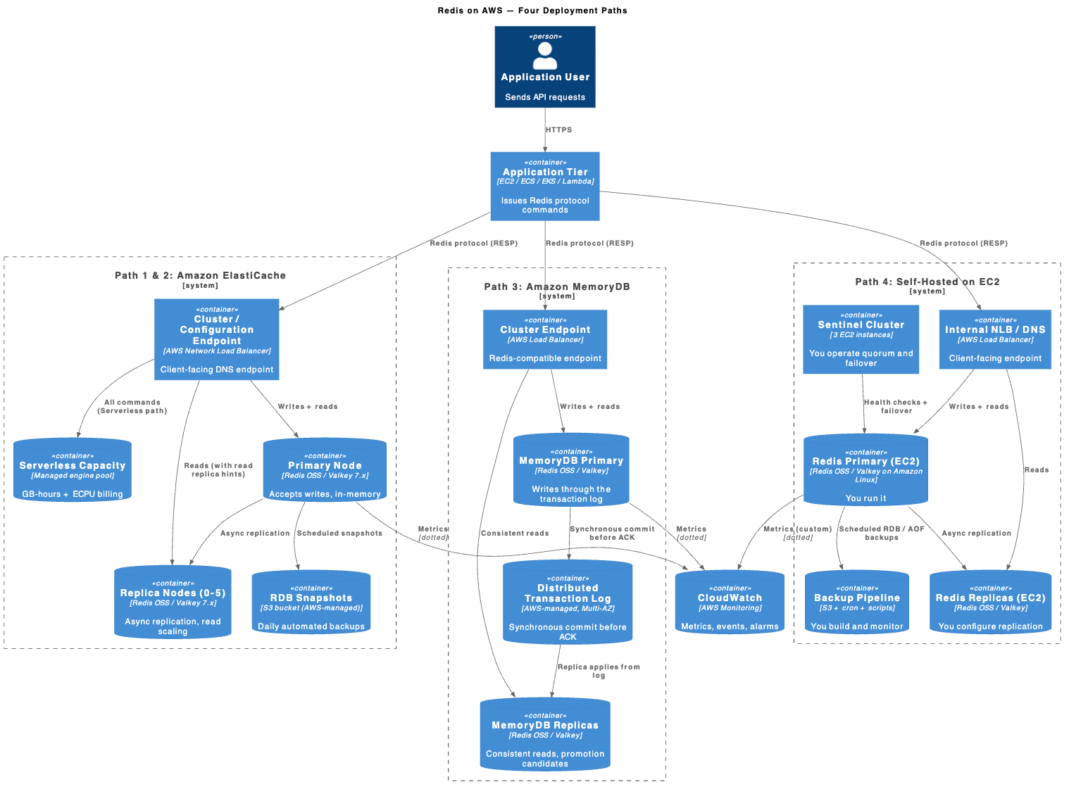 See Redis AWS C4 Container Three Paths for a side-by-side container view of all four paths, showing the control plane, data plane, and persistence layer for each.