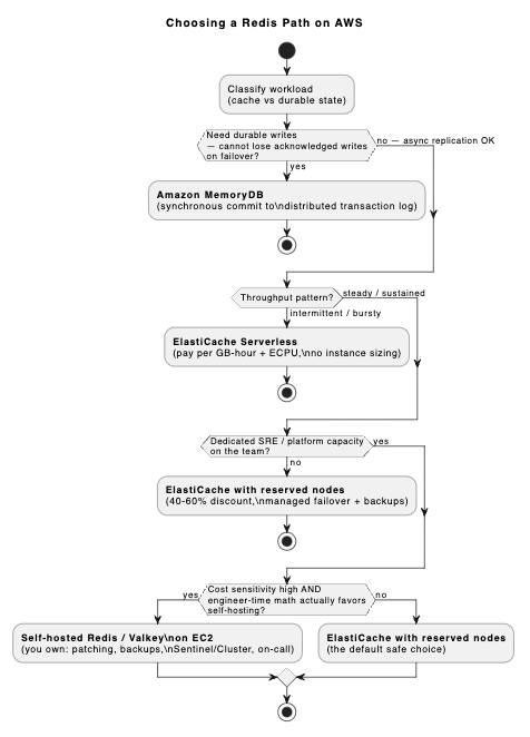 Don’t use self-hosted Redis OSS just to save money. Do the engineer-hour math honestly. If your platform team is already overloaded, managed is cheaper overall. Self-host only when you actually need the control, or the cost at scale crosses the threshold (typically 100+ GB datasets with full utilization).
