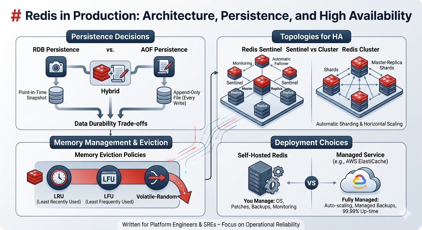 TL;DR: Redis is simple to start but tricky to run correctly at scale. This guide covers the production deployment decisions that matter: RDB vs AOF vs hybrid persistence, Sentinel vs Cluster topologies, memory eviction policies that won’t kill your app, and the self-hosted vs ElastiCache trade-off. Written for platform engineers who need Redis to stay up, not developers learning SET and GET.